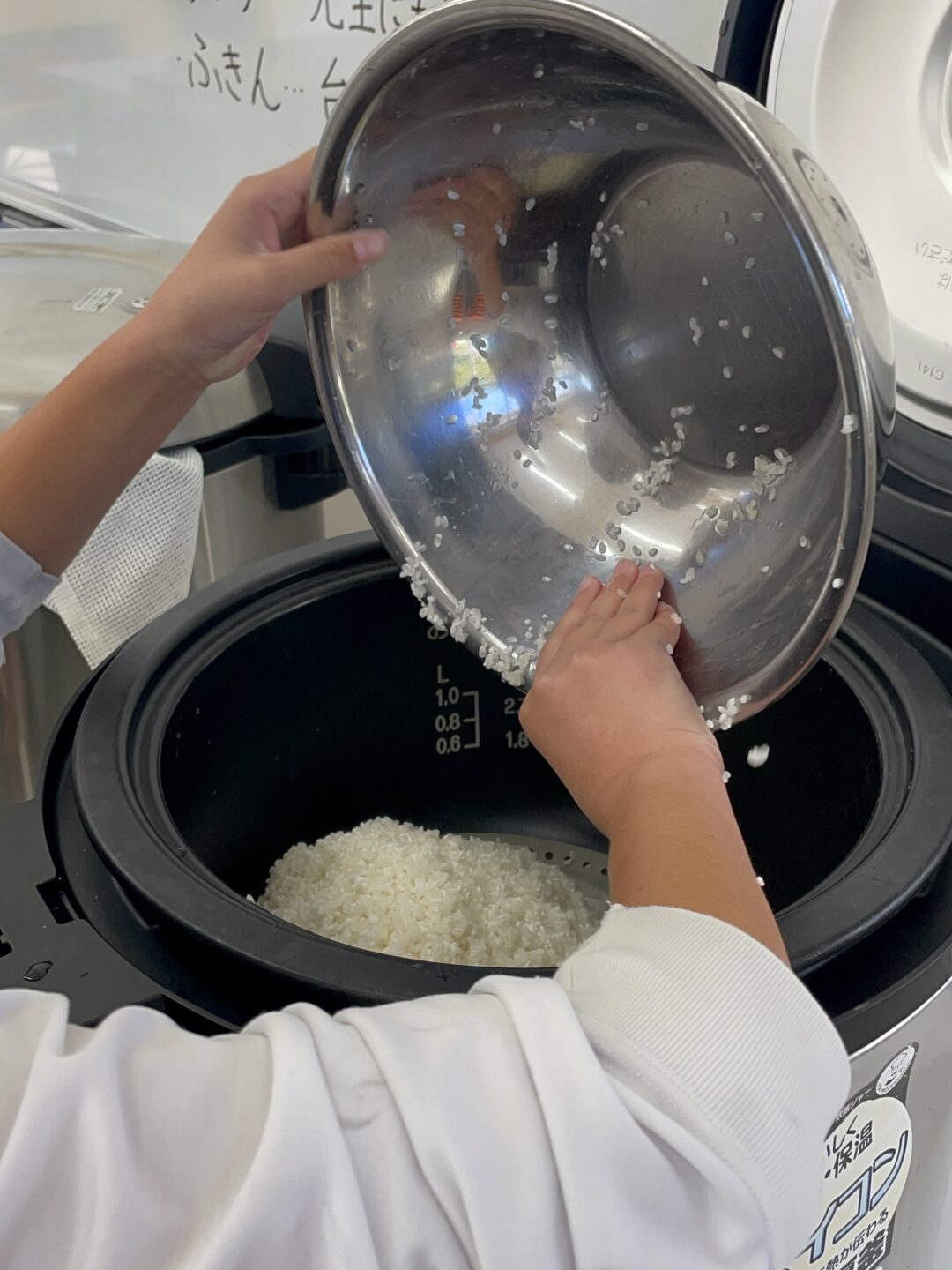 サポートに入ってくれる先生方と一緒にお米を研いでいきます。