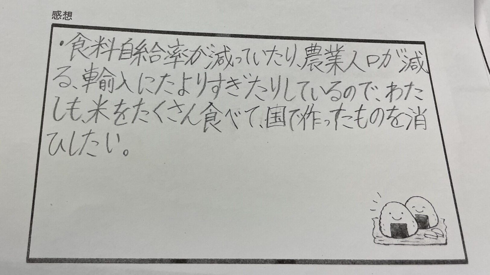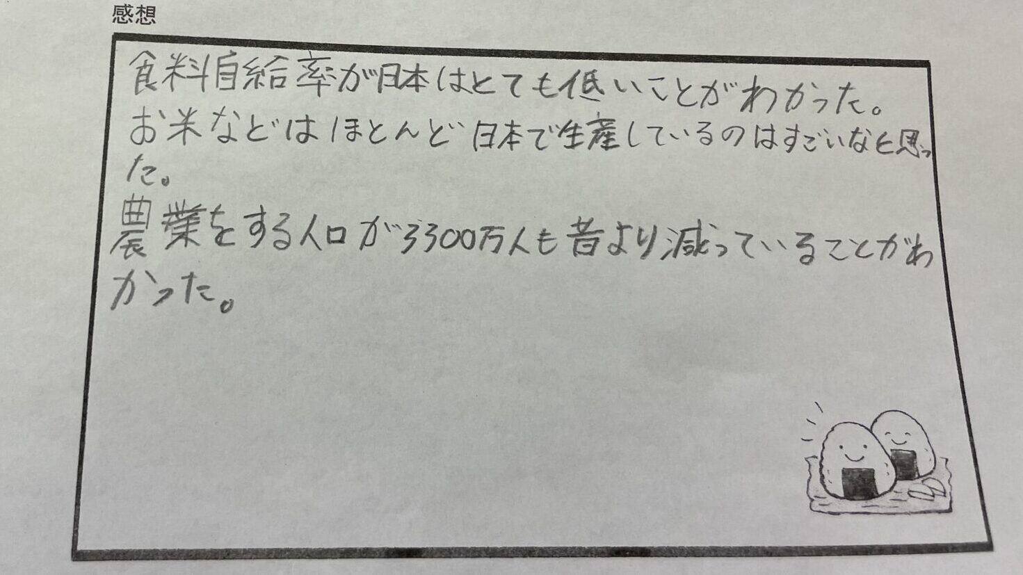 突如現れたどこかのおにぎり屋に、初めは児童たちも緊張している様子でしたが次第に慣れてきて発言も多くなり、積極的に取り組んでくれている様子でした。