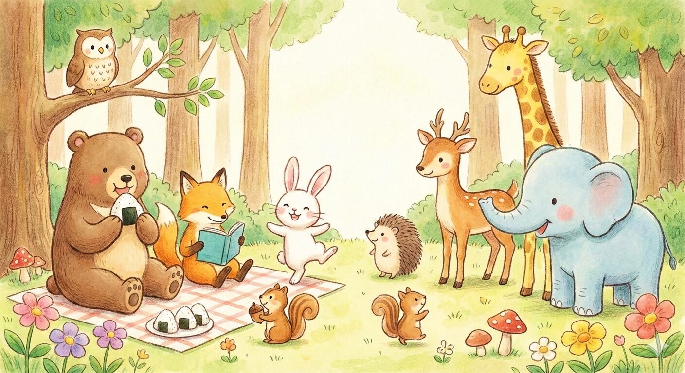 3じのおちゃに誘われた主人公が、道中でいろんな動物たちと出会い、最後はみんなの持ち寄った材料でケーキを作るという話。